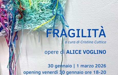 L’esposizione, curata da Cristina Cuttica, resta aperta dal 30 gennaio al 1 marzo prossimo ed è visitabile in Atelier dal mercoledì al venerdì in orario 17-19 o su appuntamento.